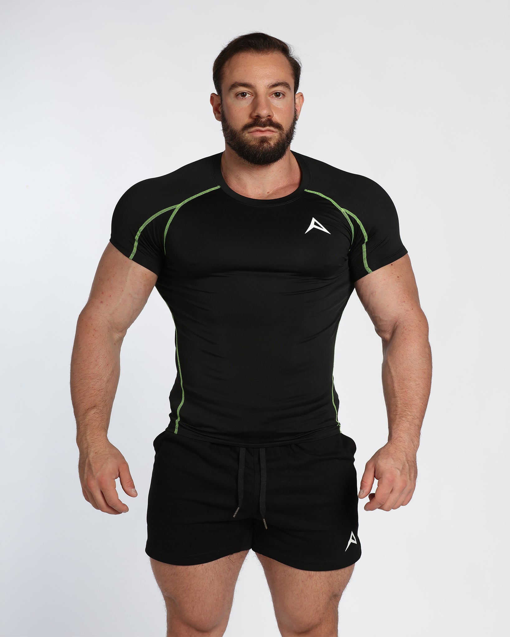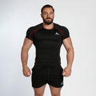 Sculpted for performance with a second-skin compression fit, this tee enhances your physique while keeping you cool, dry, and focused. Finished with bold black & red or black & green stripe detailing for that athletic edge.